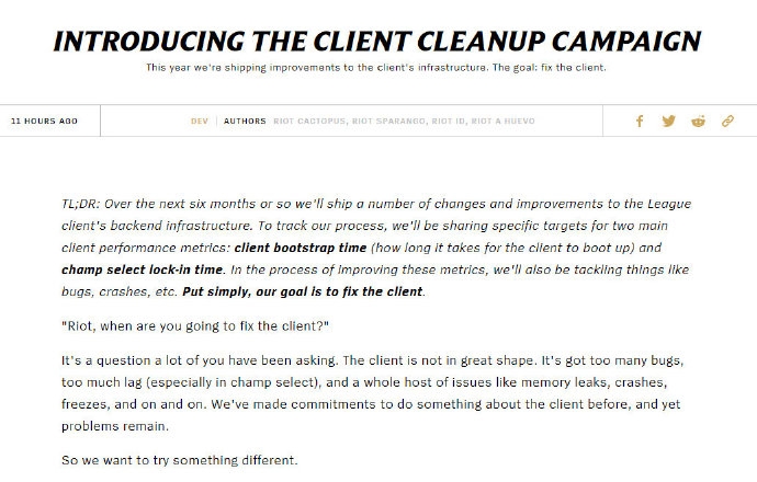 终于来了,拳头设计师宣布将修复升级LOL客户端,解决启动时间等问题。