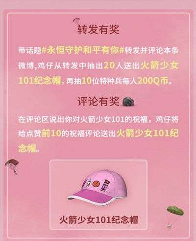 关注和平精英官方微博、带话题#永恒守护和平有你#评论并转发活动微博,鸡仔将会在转发中随机抽取20名特种兵送出火箭少女101纪念帽,10名特种兵每人送出200Q币。