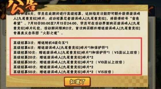 火影忍者手游每隔几个月总会有一场非常盛大的“比惨大会”,基本上参加这个比惨大会的玩家都是非酋,欧皇基本上都是在旁边围观。7月份的金鸣比惨大会即将在7月10日0点开启,也就是今晚的12点过后,无论你是打算秒出金鸣,还是用来顺便带出百豪纲手的,欧皇和非酋就要在今晚一起见证了。(下图是金鸣首付赠送碎片的情况,各位可以根据自己的V等级计算一下能够拿到多少)
