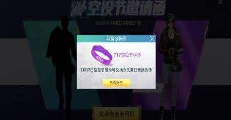 看到“选择后不影响奖励”的时候,就直接随意选择了其中一个,然后就收到了一个提示。如图所示:获得了一个名叫“717空投节手环”的道具,可以在空投节当天兑换1个永久夏日音浪头饰,也算是一个免费的永久皮肤吧。