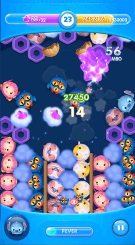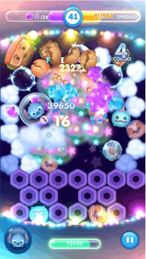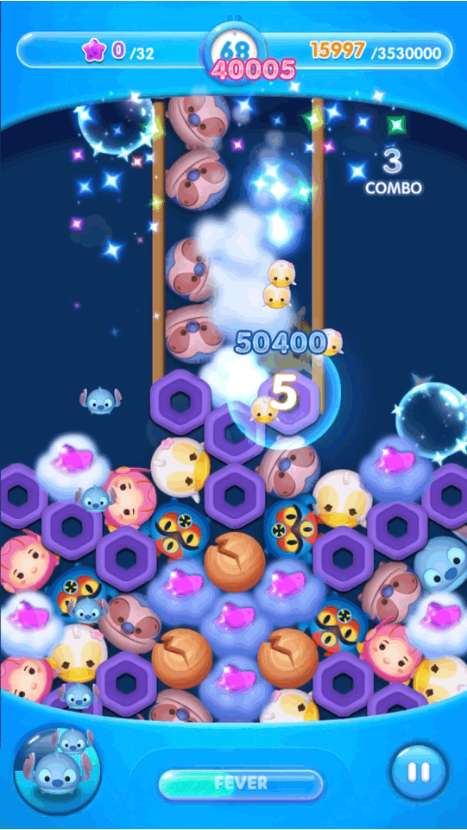 1.开局的史迪奇松松可以按照U型消除,与连消四次竖排相比可以额外获得两枚气泡炸弹,气泡炸弹可以直接对下方星星进行消除。另外,当我们连消松松时,可以进行连消的松松颜色会稍稍发亮,这样就不会遗漏偏离位置较远的松松了哦。