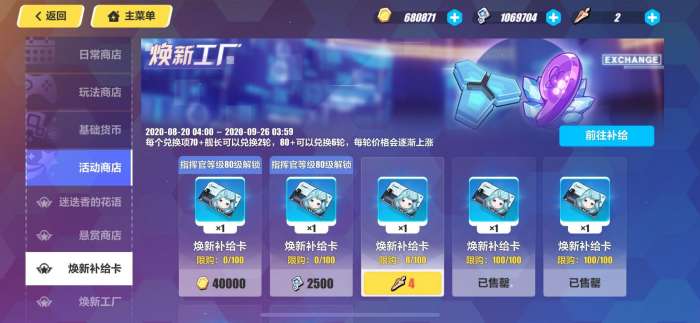 如果平时没有攒材料的小伙伴,可能这次买这个“焕新补给卡”就能让你直接掏空家底。焕新补给卡每个兑换项,70+的舰长可以兑换2轮,80+的舰长可以兑换6轮,但是值得注意的是,如果你想兑换完,是非常困难的。因为每次兑换了一个项目的一轮之后,单类项目价格就会上涨!所以你想短时间得到新S级女武神【失落迷迭】将是一件非常困难的事情。