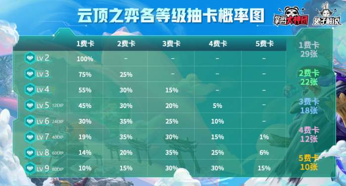 前期1费概率大幅增加,也就是说官方支持你赌1费3星,应该是为月神服务的,2费卡直到7人口都还是35%概率,而3费卡的概率大幅降低,你如果要赌3费,就要到8人口去赌,极大的降低了赌3费的节奏,增强了赌1、2费的节奏。
