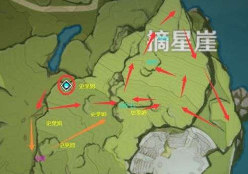 从蒙德风起地向东北前进,经过千风神殿,即可到达摘星崖。