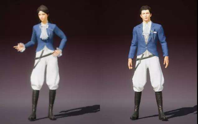 最后一款也是经典的骑马装,“白月香洋装”,男女款非常相似,上面都是蓝色短款外套,下面搭配白色长裤和黑色长筒靴,十分简约的风格,应该会是手册1级的奖励。