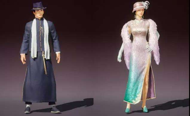 目前爆出了三款套装,首先是“不夜海上花”,光听名字就很有感觉,女款是一身渐变色的旗袍,披着粉紫色的貂,穿绿色小皮鞋,带白色手套,最后头上那顶小圆帽让整体韵味更足了。男款则是经典上海滩大哥形象,白色围巾+黑色礼帽。男女款在一起颇有几分许文强和冯程程的感觉。