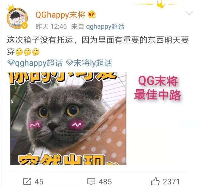在11月20号的中午,QGhappy的中单Mojo在社交平台发布了一条消息“这一次箱子没有托运,因为里面有重要的东西明天要穿”,对于“穿”这个字眼,还是让大家猜测不断的。Mojo所述的“明天”也就是11月21号,但是当天并没有QGhappy的比赛,只有eStarPro对阵JC战队,所以Mojo并不是要穿队服去打比赛。