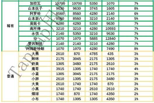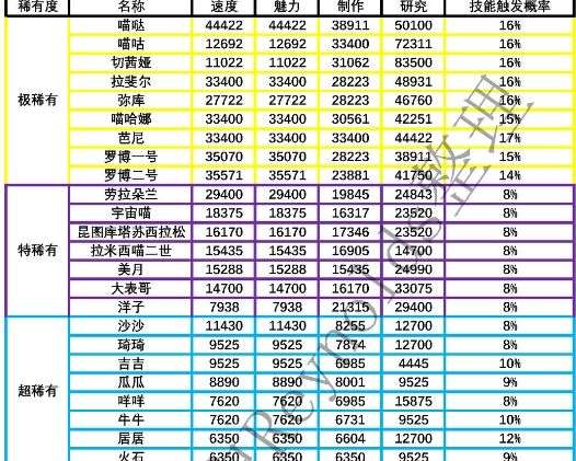 ②特稀有的拉喵、蕾喵、君乾,超稀有的喵嘤、喵叽,普通的小灰由于楼主经大量抽卡未抽到故未列入表格中,