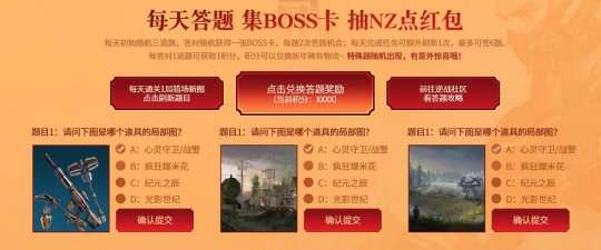 第一种:通过答题获得BOSS卡片,每天可直接获取3个题目,完成通关猎场任务可刷新一次,每日最多6次,每个题目有两次机会回答,对于熟悉游戏的玩家,这些题应该无法难倒你们吧!不过万一遇到不确定的答案,也不要紧,论坛网友可以帮助你答题,直接活动网页点击【前往逆战社区答题攻略】即可获取正确答案。