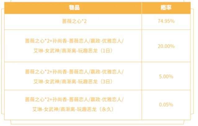 内测皮肤幸运宝箱:打开后必得蔷薇之心*2,还有一定几率额外获得永久皮肤/皮肤体验卡(孙尚香-蔷薇恋人、嬴政-优雅恋人、艾琳-女武神、高渐离-玩趣恶龙)。