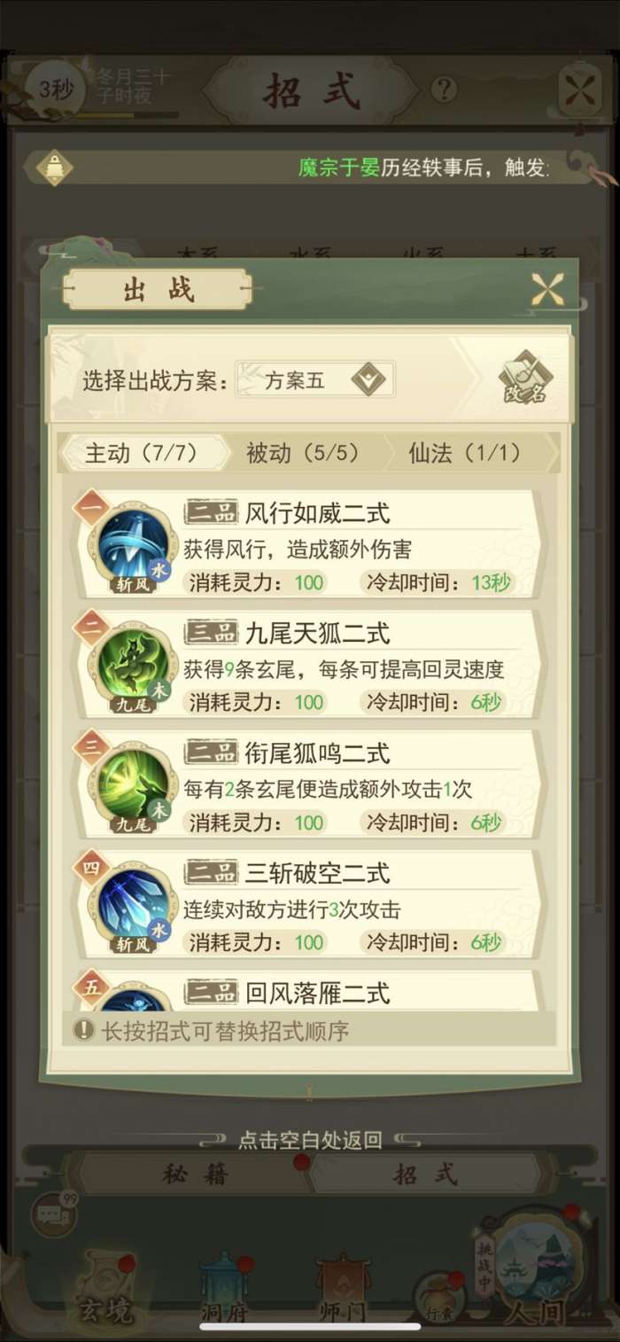 主动:风行-九尾-衔尾-三斩-回风-光明无定-摩柯(可换其他金)。 (三斩和回风位置可互换)