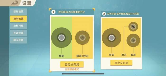 在控制设置页面提供2种操作习惯可调整,左右两个操作模式的区别就是右边的模式把射击功能单独出来一个按键,更适合三指以上操作的小动物发挥,萌新们还是推荐使用默认的左边操作模式;