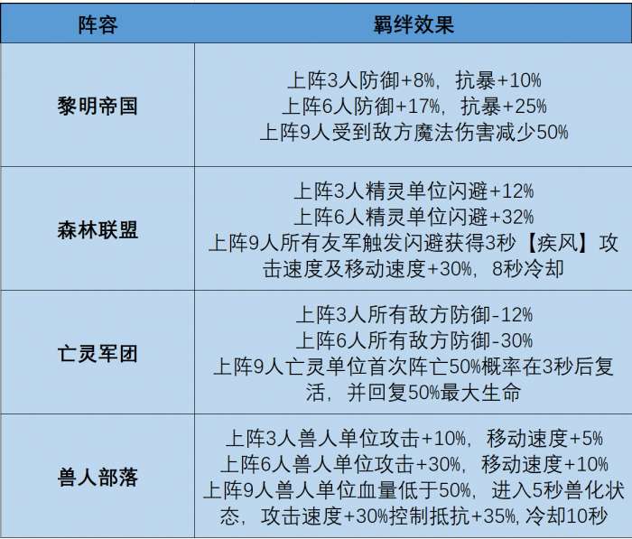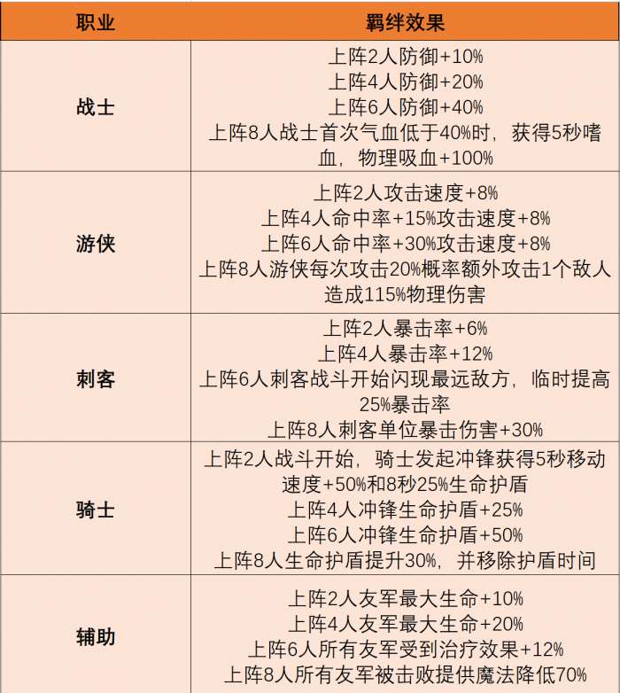 羁绊我认为优先考虑阵容羁绊,再考虑职业羁绊,下面就给大家罗列下各种羁绊效果