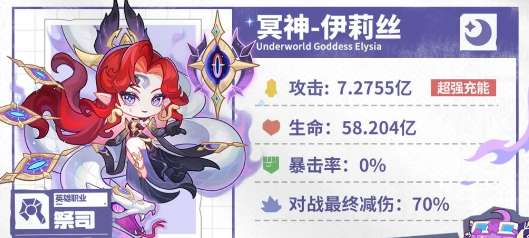 冥神伊莉丝是兼具高额群体伤害与强力控场的核心英雄。其技能“魔蛇冲击”与必杀“冥渊之瞳”能造成大范围眩晕与持续爆发,配合被动“复仇决意”可大幅提升全队怒气循环。建议围绕她组建暗系阵容,以充分发挥其控场与输出优势,在战斗中掌握节奏。