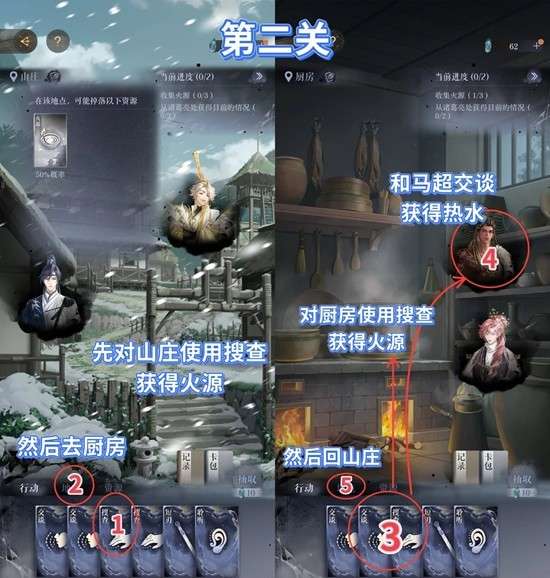 搜查牌和交谈牌都有概率获得资源,我的行动顺序可供参考,如果你已经拿到指定资源,就不需要完全按照我的行动顺序做,直接进行下一步即可