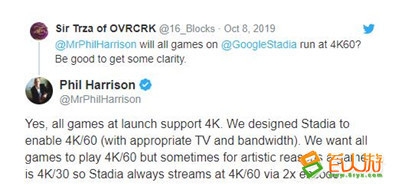 近日一名网友在Twitter上问到了谷歌Stadia总负责人Phil Harrison,是否Stadia上所有的游戏都支持4K/60FPS,对此Harrison回复说:“所有游戏在发售时都支持4K。