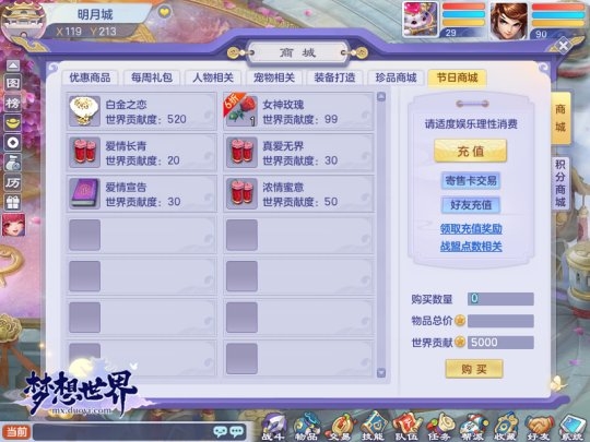 全新《梦想世界》情人节节日商城2月14日-2月16日开放,出售蓝色爱恋等鲜花、烟花道具。另外,白金之恋和蓝色爱恋赠送/获赠数量达到99朵还将获得新成就、称谓哦。
