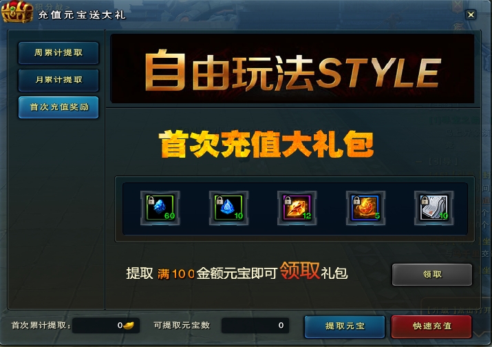首次提取100元宝,赠送:1品精炼石(绑定)60个,2品精炼石(绑定)10个,紫色三品重铸石(绑定)12个,中级经验成长丹(绑定)5个,万元银票10张。