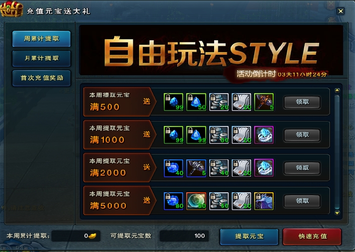 周提取1000元宝:赠送一品精炼石(绑定)99个,二品精炼石(绑定)99个,万元银币30个,万元银票20个,传奇冰灵戒指(经验增加20%)1个;
