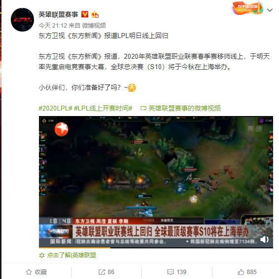 昨日,东方卫视《东方新闻》报道LPL线上回归的消息,报道称,2020年英雄联盟职业联赛春季赛移师线上,于明天率先重启电竞赛事大幕,全球总决赛(S10)将于今秋在上海举办。
