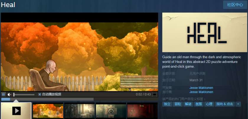 解谜类游戏,许多玩家一定都玩过。但以一个迟暮老人为主角,且名为《治愈(Heal)》的解谜游戏,你玩过吗?本次PK手游网东东就为大家介绍一下这款预计在3月31日才上架Steam的游戏。玩家的目标就是指引以为孤独老人,让他走出心中的黑暗世界!
