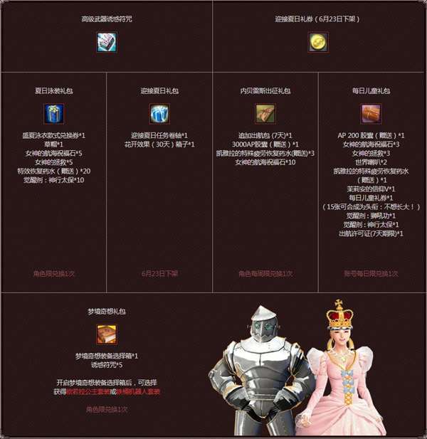 在5月19日维护后至6月16日维护前,英雄们可消耗马赫印记兑换“迎接夏日礼包”,使用礼包中的卷轴即可获悉任务“迎接炎炎夏日”,完成任意战役后均可从掉落中获得“迎接夏日冰凉果汁”(每日限获得10个),将此道具交给奇怪的旅行者即可收获“迎接夏日礼券”,集齐一定的礼券之后可于兑换商店中兑换黑海无法者套装、黑海海盗套装及茉莉安的信仰V哦!除通过活动获得礼券外,英雄还可从商城之中兑换迎接夏日礼券。