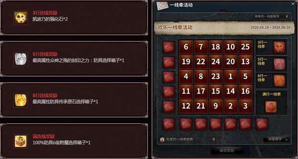 在5月19日维护后至6月16日维护前,完成95级以上Raid战役,可从战役掉落中获得欢乐一线牵礼券(每周可获得35张),每获得5张礼券可快速合成为欢乐一线牵数字选择袋,开启后可选择1~25的一线牵数字。当横、纵、斜连线时,即可获得对应奖励,还会根据成功连线数获得额外的连线奖励。