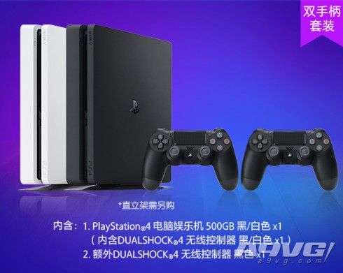 PlayStation®4双手柄套装限时特惠,内含PlayStation®4主机(黑色/冰河白 500GB)一套、额外DUALSHOCK®4无线控制器(颜色请参照渠道产品信息)一个,单品建议零售价总和为2,379元人民币,活动价2,099元人民币。
