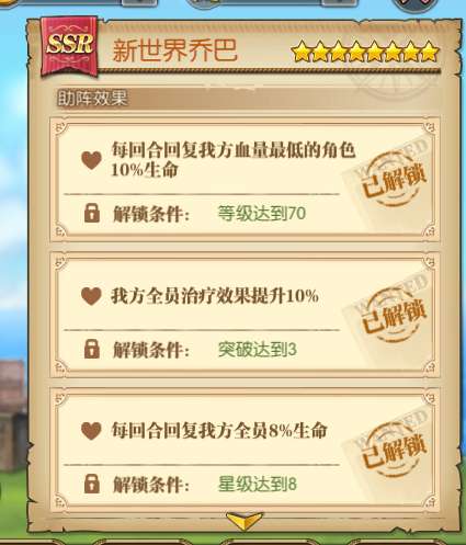 新世界乔巴的助战效果很容易理解。突破三的全员治疗效果提升,不但对拥有复活机制的角色有益,还对PVE战斗有着极大的帮助。70级助战与8星助战都对团队带来了巨大的收益,每回合!每回合!每回合都能回复全体角色8%血量,远超过大熊和甚平!