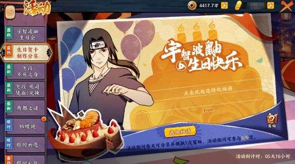 活动时间:6月5日5点至6月12日5点参与等级:主角等级达到30级活动说明:精选的祝福,送给最爱的鼬神!活动期间选择祝福语生成一张生日贺卡,成功分享即可领取奖励。据说6月9日生日当天奖励会不一样,当天晚上18点和19点准点还有组织红包派发,记得领取哦!