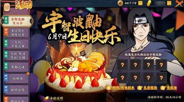 活动时间:6月5日5点至6月12日5点活动说明:1、收集礼物送给宇智波鼬,共有8种礼物哦!活动期间进行剧情/困难副本、生存探险(不包含幻境探险)、竞技场都有机会掉落礼物;2、蛋糕从宇智波鼬生日当天5点开始进行剧情/困难副本、生存探险(不包含幻境探险)才会掉落!3、点亮礼物图标,可获得宇智波鼬的生日回礼;不同礼物获得的回礼不同,首次赠送和再次赠送获得的回礼也不同;4、首次赠送并点亮所有礼物可获得宇智波鼬的生日大礼包,不要错过哦!生日贺卡制作分享