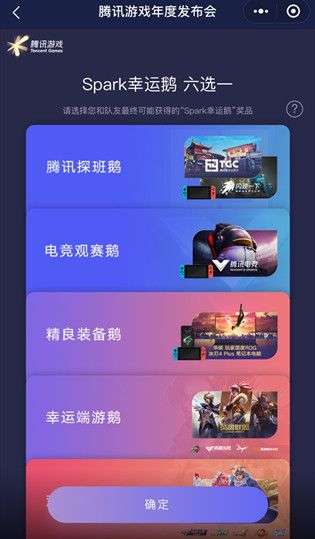同时,预约组队还可以参加超豪华、覆盖线上线下的“Spark幸运鹅”抽奖,当小队满员后即可获得第2次抽奖机会——在腾讯游戏年度发布会结束前,我们将从六个奖池中分别抽出1支小队(全队5人)获得对应奖品。