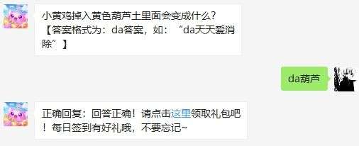 今天天天爱消除每日一答的题目是“小黄鸡掉入黄色葫芦土里面会变成什么?”下面小编为大家带来今日份答案,每日持续更新,欢迎大家继续关注我们!