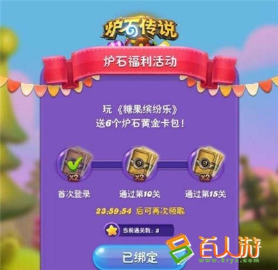 账号绑定成功后,点击游戏内的活动可以看到自己的战网ID,同时活动上面还能看到任务完成情况,总共三个任务:绑定战网账号、闯关10关、闯关15关。绑定成功后就已经默认完成第一个任务了,直接点击画面中的卡包,就可以立刻领取了。