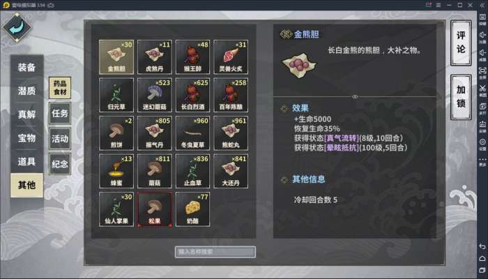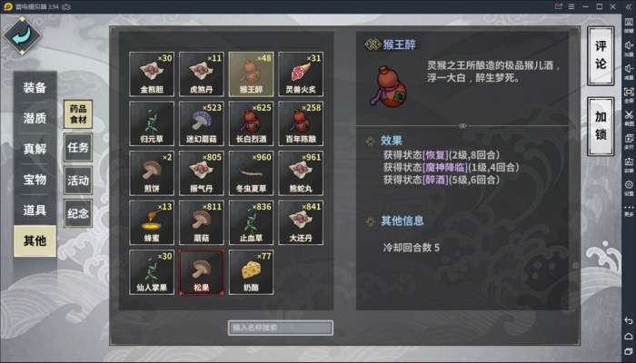 长白七八层出品,这个药给我的感觉就是迷惑,一个酒类带恢复,基本上没什么用,在假酒的情况下,2级的恢复也可能被砍爆,但是优点是恢复持续的时间够长,魔神降临的话,尚且不如百年陈酿,唯一特殊的是这个是三个酒类里面唯一一个可以提高非1级醉酒加成的药品,5级的醉酒可以给更大的几率打出连击,但是我觉得这是有些浪费了,因为醉酒的存在,大概率是不会吃满六个回合的连击输出的,打连击肯定是需要装备心决功法做后盾的,只是靠这个5级的醉酒打连击,无一例外全部都翻车了,在我看来,在PVE中喝酒加连击更多的是补缺作用,在进本准备之后打连击缺了一些,喝个酒让打连击的几率高于及格线就行了,而这个作用一般1级的醉酒就差不多是可以满足了。醉酒的假酒概率是跟醉酒等级无关的,但是我每次吃这个药总觉得晕的概率会高一些……我的使用概率看他和其他药品的数量对比就能看得出来
