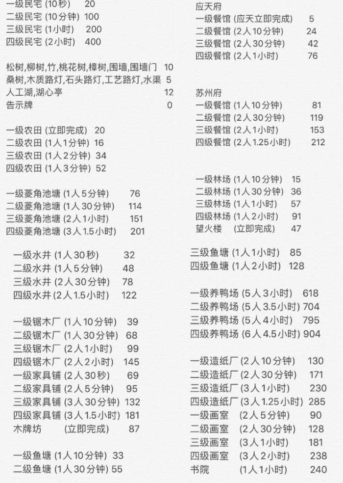 主要白天拆建:应天府的宗祠、盆景园、药铺、铸钱所,苏州府的钓鱼台、花灯台、医馆、铸钱所。晚上睡觉时拆建:道观,油树林,铸钱所。(以上仅供参考,各人情况不一样)