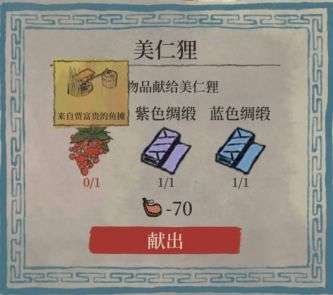 紫色绸缎:来自锦绣的绸缎铺,铜钱*1000,砚石*3,栀子花*5;