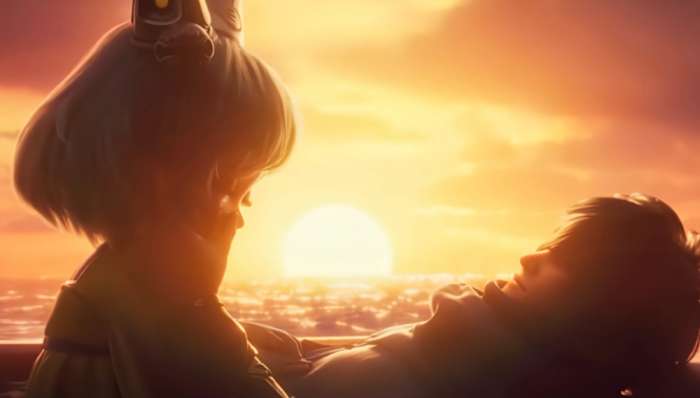 负伤的澜抱上蔡文姬冲进海里逃跑,余晖落日之下海面恢复了平静,澜静静地躺在船上,身旁是哭成泪人的蔡文姬,“我见过很多人倒在我面前,但还是第一次倒在别人面前,也没什么特别的,就是有些困而已”,CG的最后,澜轻轻地拭去蔡文姬的泪水,微笑着闭上了眼睛。