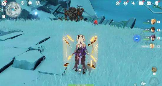 最后,从七天神像处便可来到来到山顶,解锁三块碎片后,道路的暴风雪已经消失,可以放心前往山顶,到达山顶后会发现,原本的碎片来到了山顶,需要再使用红石buff攻击解封,此时,每块碎片只需要攻击一次,由于三颗红石过于分散且距离碎片较远,此处建议大家使用弓箭角色。