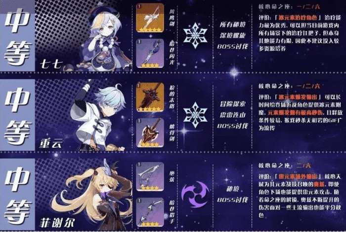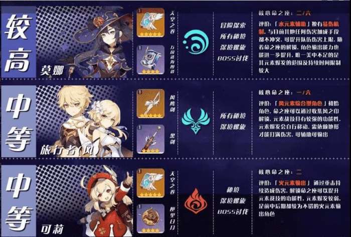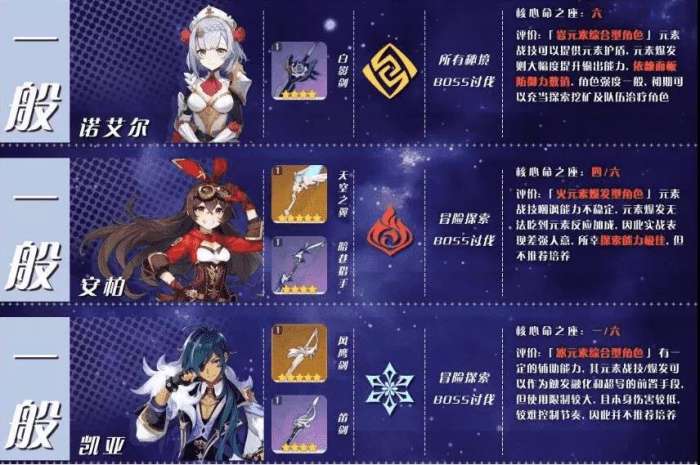 新出现的几个A级角色是主C辛焱、北斗,副C凯亚,辅助安柏和主角。其实北斗作为副C的价值更高,大招的倍率非常高,堪比行秋,但是这份榜单中北斗一直都被列为主C,可能是外服玩北斗的玩家不多,没人去开发。