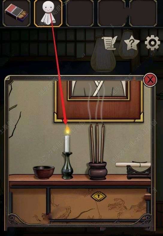 1. 在游戏一开始跟着提示点击台子,在台子上面可以找到火柴,是用火柴点燃蜡烛。