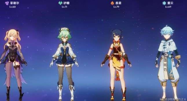 钟离提供护盾、温迪聚怪、香菱、重云大招轮流爆发,互相打融化,输出极高!