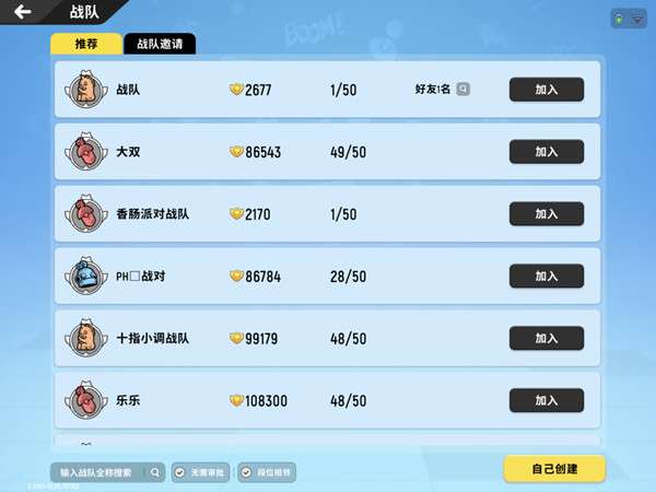 主界面新增「战队系统」入口,点击即可开启战队之旅!选择加入心仪的战队或是花费100糖果创建属于你自己的战队。队友们,我们游戏里集结!