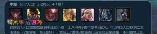 2-1拉4,2-5拉5(打野爆金币必提前F,除非你有10金币可考虑不升)。打连胜嫖3费卡 ,没连胜也没连败,则尽量吃上利息。2阶段推荐的过度阵容: