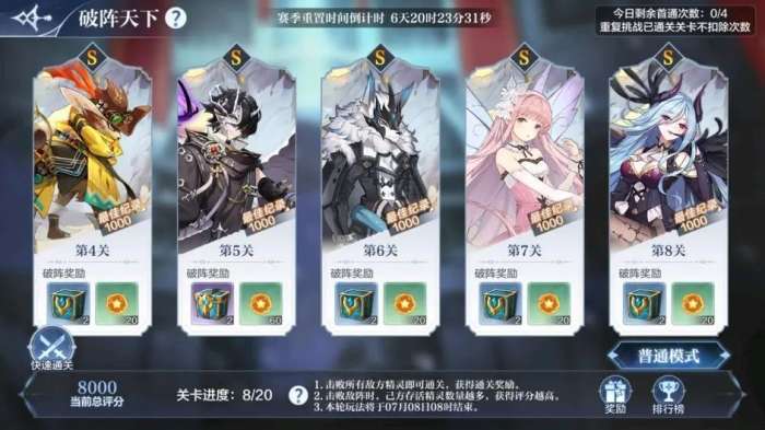 并且破阵天下普通模式关卡数量降低为20关,每日剩余首通次数降为3次,可获得的奖励不变。