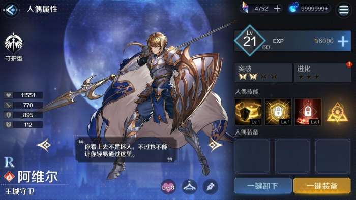 阿维尔的物抗和生命值还是十分优秀的,虽然魔抗是短板,但是超硬的身板在前期过副本还是很舒服的,主动技能守护还可以为友方承担伤害,R卡的优势很明显就是比较容易成型,也容易获取,建议用来前期过渡。