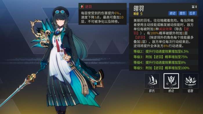被动是逆翎的核心技能,每当敌方单位被附加除【逆羽】外的减益效果时,就会被附加一层【逆羽】,每层逆羽会使目标受到的伤害提升6%,速度下降3点,最高叠加10层。除逆翎外,此效果每个技能最多触发一次。敌方单位行动结束后,逆翎拉条友方全体,推荐点到4.5级,吃满速度加成