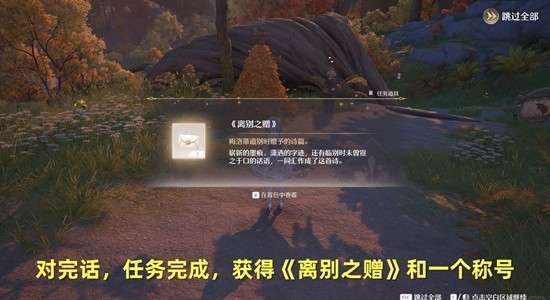 进入剧情,结束后,任务完成,获得《离别之赠》以及一个称号;