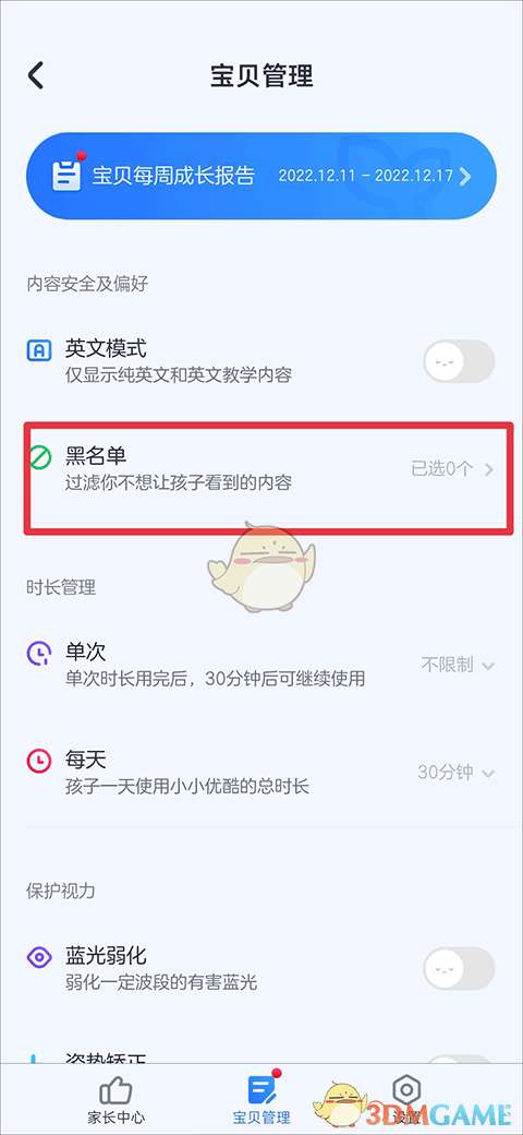 打开小小优酷App,在首页点击右上角“家长”功能,验证家长身份后进入家长中心,点击“宝贝管理”,再选择“黑名单”功能,进入后选择设置视频或绘本黑名单,点击“从历史加黑”,选中要添加的视频或绘本后,点击“确认添加”即可设置成功。