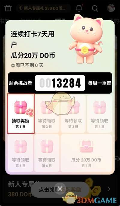 4、在新人专属界面,每天上线即可领取金币,总共380金币免费领取;